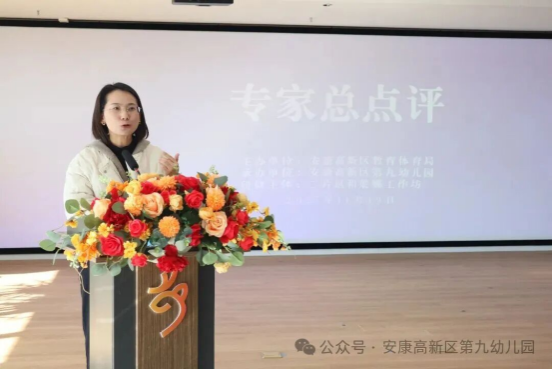在教研研讨环节,钱敏讲师以专业视角引领交流走向深入。针对梁娜工作坊提出的“自主游戏实践痛难点”等核心问题,她结合观摩案例与学前教育前沿理论,与一线教师共同梳理主题式区域游戏与随机游戏的平衡策略,为基层教师破解实践困惑提供了清晰的理论支撑与操作指引。其总点评环节更是将活动推向高潮,通过具象化的游戏案例分析,为教师引导儿童“带着目的进行游戏”指明了科学方向,充分彰显了高校专业人才的理论功底与实践洞察力。