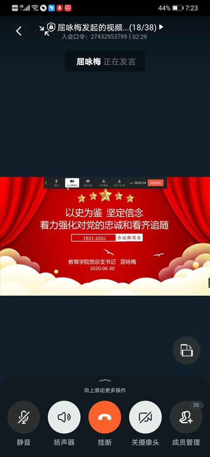 为庆祝建党99周年,推进“不忘初心、牢记使命”主题教育常态化、落实“两学一做”学习教育的基本要求,加强党史、新中国史学习教育,6月30日晚,教育公司党总支书记屈咏梅为教工二支部全体党员上了一堂生动的线上党课,党课主题为“以史为鉴,坚定信念—-庆祝建党99周年”,教工二支部全体党员参加了本次学习。