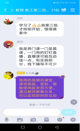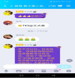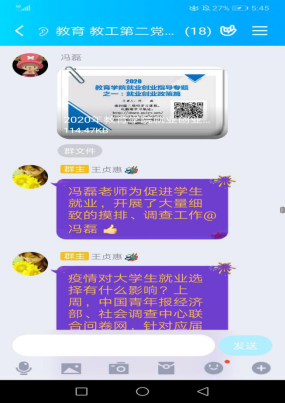此次主题党日活动采取线上交流的形式,全体党员主要围绕“疫情期间党员教师的责任与担当”、“党员教师对员工的就业帮扶情况”等议题进行讨论。支部组织委员张婷婷首先做了交流发言,她结合疫情期间线上教学的经历谈了体会,分享了自己在慕课建设中的心得和线上教学经验,充分得到了大家的好评。其他党员都交流线上教学的心得体会,纷纷表示在使用多元化的工具与手段践行党员教师的责任担当的同时,还要充分挖掘疫情防控中的思政元素,内化于心,外化于形,不仅传播知识,还要努力强化疫情期间的思想引领和心理辅导。