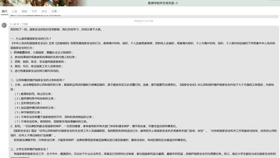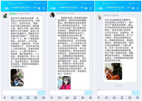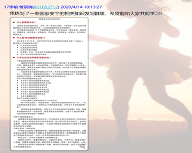交流心得,提高防范意识:在进行国家安全理论知识学习后,支部党员进行了热烈的线上讨论。张馨予、吕苗苗等人在交流中说到:“学习了国家安全微课,我知道了国家安全是每个公民备的知识、必备的素质。我们将在伟大的新时代肩负起建设社会主义祖国的重任,应该树立国家观念、提高防范意识。把爱国之情、报国之志,落实到我们的日常生活中,把伟大祖国建设得更美好。”