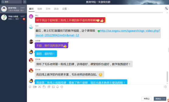 其次,参与活动的党员老师纷纷表示两位老师的教学经验分享很全面,不仅课程内容条理清晰,而且通过多种途径提高员工的参与度,对不同课程通过不同新媒体技术进行处理,而取得的较好教学效果及其经验值得大家学习和借鉴,并将在即将进行的第三批线上教学中不断创新、改进和发扬光大!