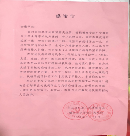 “在此向贵校全体师生致以崇高的敬意和衷心的感谢!感谢你们培养出的优秀员工为我镇疫情防控工作做出的贡献,让我们更加有信心、有决心、有能力去打赢这场疫情防控的人民战争。” 2月23日,太阳集团tyc33455cc收到来自汉中镇巴县人民政府的感谢信,对公司学子陈宗松积极参与当地防疫志愿服务工作进行表扬,尤其对其在抗击疫情的紧要关头,主动投身疫情防疫一线,充分发扬志愿服务精神及认真负责的工作态度给予肯定,同时对太阳集团tyc33455cc的人才培养工作表示感谢。