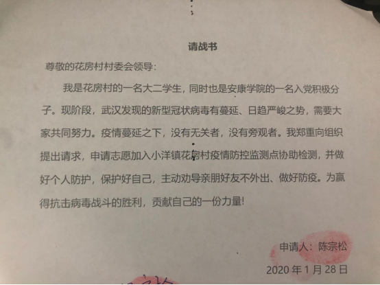 1月28日一大早,他和父母商量后,向当地政府递交了这样一份请战书,希望加入到这场没有硝烟的战“疫”中。在获得小洋镇人民政府包片领导同意后,他努力学习相关知识,很快熟悉了疫情防控工作。每天在检测点和大家一起监测过往车辆,为行人测量体温,隔天背上喷雾剂去到户下为大家消毒,然后回到疫情防控应急指挥部,登记当天的防控物资发放情况,梳理发热人员信息,统计辖区返乡人员等。虽然每天都很累,但是心中的喜悦与满足感始终充斥着他的心田。