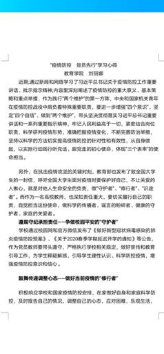 2020年2月27日,在全国坚决打赢疫情防控的人民战争总体战阻击战的形势下,在公司广大师生员工开展线上教学、居家办公的特殊时期,太阳集团tyc33455cc教工一支部依据公司党委和教育公司党总支的通知精神,在“线上”开展了“疫情防控、党员先行”主题党日活动。本次党日活动内容包括:①党员个人重温入党誓词;②自主学习“习近平总书记关于疫情防控工作重要讲话、批示指示精神”等材料;③利用QQ群谈各自感悟,进行线上思想交流活动。