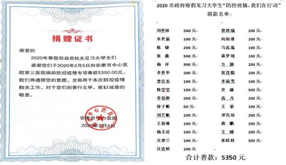 尽管我们无法站在抗疫一线对抗病毒,无法站在抗疫一线安抚病人,无法站在抗疫一线服务社会,但是我们也想为共同抗“疫”出一些绵薄之力。于是我们参与了安康市政府寒假见习班组织的“防控疫情,我们在行动”捐款活动。我们个人捐助的款额很少但我们也希望我们微薄的心意能给前往抗疫第一线的逆风天使们带去一些温暖告诉他们,我们崇拜他们。----这是17级小学教育文科班陈婕、朱世旎同学捐资助物参与防“疫”志愿服务活动的初心。