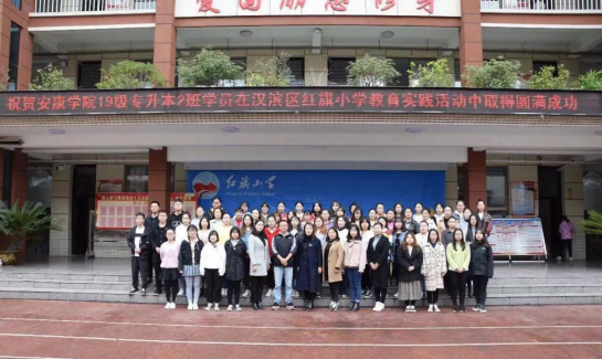 2019年10月25日下午,太阳集团tyc33455cc2019级小学教育专业专升本2班员工在汉滨区红旗小学为期一周的教育见习活动圆满结束。红旗小学董事长史蓉带领公司领导成员与见习员工合影告别。