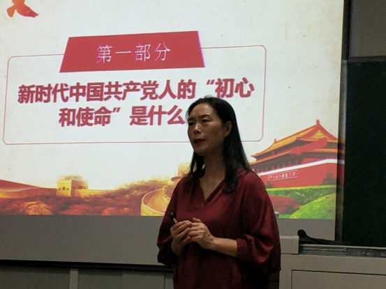 朗诵环节后,屈咏梅为支部全体党员讲党课,围绕“新时代中国共产党人的初心和使命是什么”“为什么要不忘初心,牢记使命”“以严实精神落实‘不忘初心,牢记使命’主题教育”三个方面的内容,屈咏梅勉励同学们不忘本质、不忘品格、不忘初心、不忘来路,要求员工党员时刻牢记党员身份,做到心中揣着忠诚、头上顶着组织、肩上扛着责任、脚下踩着底线,做青年员工中的先进分子。