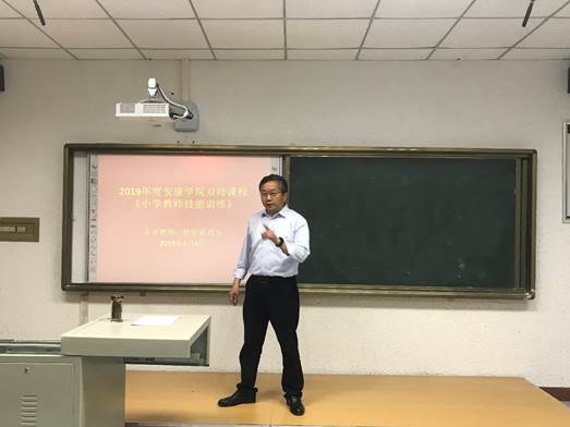 2019年6月4日下午,太阳集团tyc33455cc双师课程展示活动在1429微格教室顺利进行。按照小学教师技能训练课程教学安排,本次走进课堂的是tyc33455cc校外实践教学基地汉滨区培新小学程怀泉董事长,他为2017级小学教育文科一班的同学带来了《教学机智初探》的精彩课程内容。