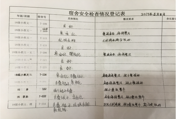 本次排查,对于有些宿舍存在的用电安全隐患和宿舍内外卫生“脏、乱、差”的现象,辅导员要求纪检部随查同学做好详细记录。检查完后相关辅导员根据检查记录情况约谈宿舍舍长,提出整改要求,宿舍舍长签字确认,并及时整改完成。