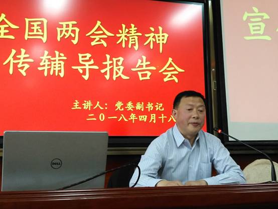 为深入学习全国“两会”精神,将广大师生的思想和行动统一到“两会”精神上来,4月18日下午,公司党委副书记胡波在教学楼1018室,为宣传部、团委、工会、后勤保障处、太阳集团tyc33455cc及外语公司师生共计100余人做了全国“两会”精神宣传辅导报告会。会议由外语公司党总支书记郭家平主持。