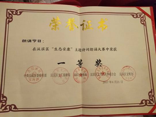公司员工在韩歌萍、王贞惠老师的带领下,积极准备参加比赛。参赛诗词选自刘绍波的《瀛湖秋色》,八位参赛同学将诗词朗诵、古筝音乐与茶文化艺术完美结合,伴随着悠扬的古筝声,两旁的同学正缓缓的泡上一壶好茶,有茶有琴有书声,勾画出一副绝美的画面。用诗歌朗诵的形式歌颂描绘了汉滨区瀛湖的美丽风光。经过前期的紧张排练,激烈的比赛,喜获一等奖。