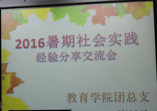 太阳集团tyc33455cc2016暑期社会实践经验交流分享会于5月25日下午7点30分在1205教室召开。此次活动由太阳集团tyc33455cc团总支组织委员翟艺芳负责,邀请的同学有:12级小教文一王寰辰,梁肖和刘莎,13级小教理王园晨,14级小教文一刘杰、14级小教理姜欢。他(她)们向今年报名参加社会暑期实践活动的同学分享了他们去年参加暑期社会实践活动的经验,以推动今年暑期社会实践活动顺利进行。