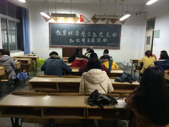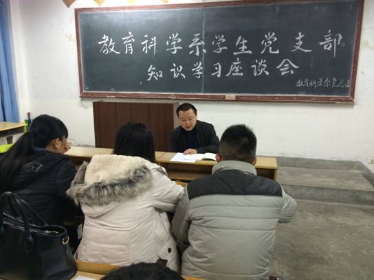 为了贯彻落实党的发展要求,教育科学系员工党支部按照中共中央办公厅《中国共产党发展党员工作细则》的精神,于2014年11月24日在1404召开了教科系员工党支部知识学习座谈会,出席此次座谈会的有教育科学系员工党支部书记赵斌老师、系员工党支部成员、系员工党员和预备党员、以及各班团支书。