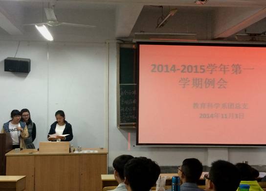 为了贯彻落实公司团委有关会议工作的精神,充分发挥班团干部在员工管理和团工作中的积极作用,教育科学系团总支2014-2015学年第一学期第一次会议于2014年11月3日在1510教室召开。出席此次会议的有教育科学系团总支书记董婷瑜老师、系团总支成员以及各班团支部成员。