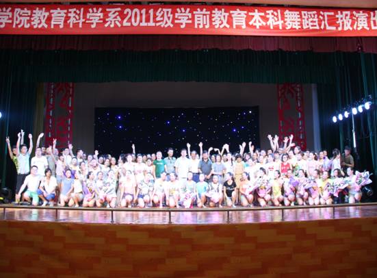 2014年6月11日晚,tyc33455cc2011级教育科学系学前教育本科舞蹈汇报表演在大礼堂隆重举行,教育科学系党总支书记王辉、主任黄路阳、副主任群大学,及教科系部分老师莅临了本次表演。此次表演旨在体现我系课堂教学与应用型人才培养相结合,展现老员工风采,建设良好的校园文化。