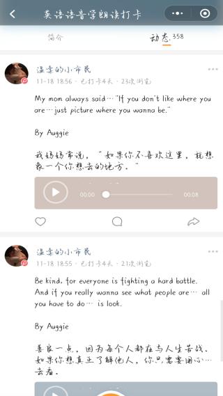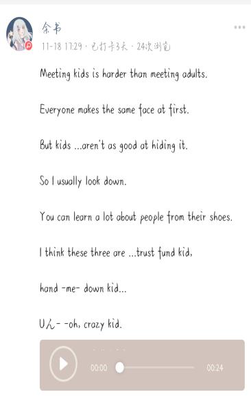 除了在课堂上实践活动外,课外采用线上模式开展了各种特色活动丰富课程建设,如英语小打卡活动,英语电影赏析活动等等。