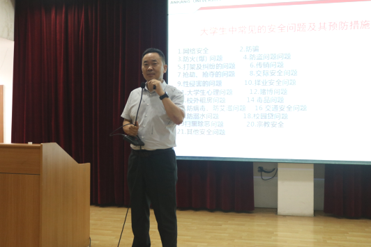 为进一步落实公司关于开展员工安全教育通知的相关要求,结合新生教育工作计划和安排,太阳集团tyc33455cc联合保卫处处长王开忠为公司2021级新生进行“新生安全教育讲座”。讲座于2021年9月8日晚,在一号教学楼六楼报告厅举行,党总支副书记赵斌、辅导员邹珊及2021级新生代表参加了活动。