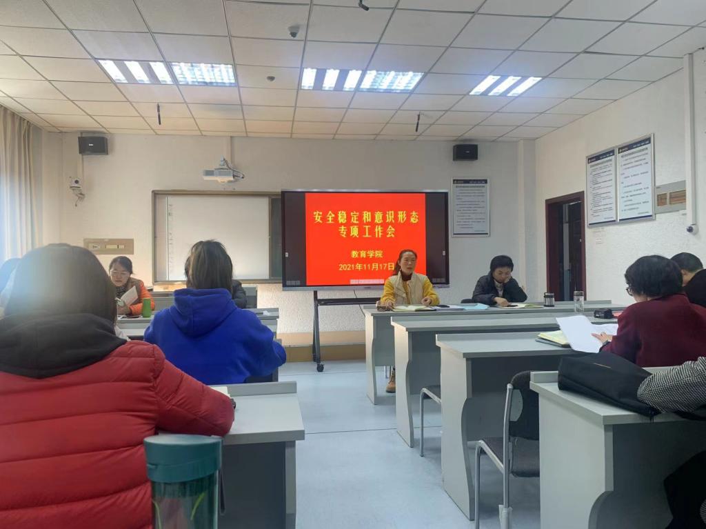 2021年11月17日下午,太阳集团tyc33455cc在1429室召开稳定安全暨意识形态专项工作会议,全体教职工参加了会议。