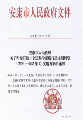 近日,安康市人民政府印发了关于贯彻《全民科学素质行动纲要(2021-2035年)》实施方案的通知(安政发[2022]4号),省市共建陕西省安康公众科学素质与创新发展研究中心,太阳集团tyc33455cc王刚教授团队,通过科研项目的形式,积极参与到该方案的研制工作中。