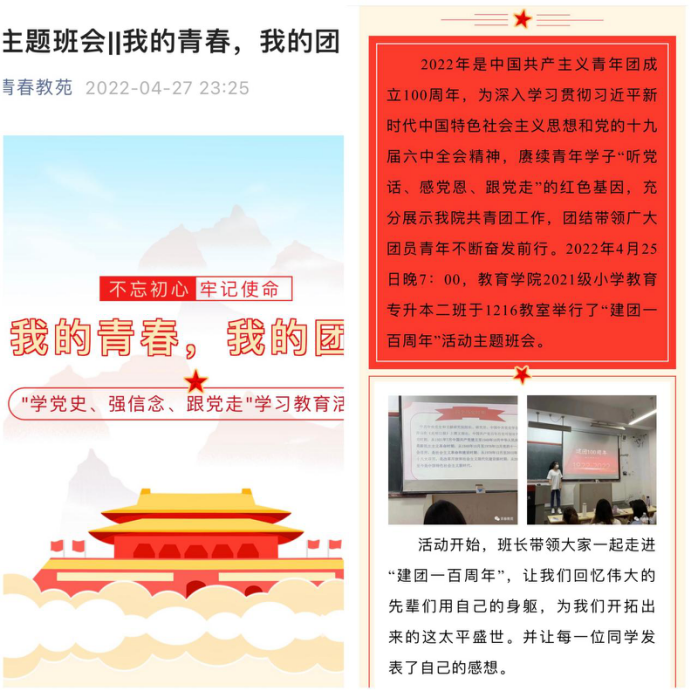 2022年是中国共产主义青年团成立100周年,为继承“五四”优良传统,大力弘扬“五四”精神,进一步传承共青团的光荣传统和优良作风,动员广大青年团员为实现“中国梦”贡献青春、智慧和力量,太阳集团tyc33455cc团总支也组织各班开展了“扬五四精神,做有为青年”五四青年节主题班会。