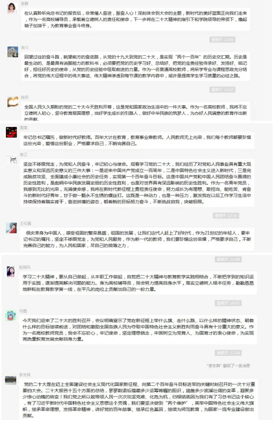 太阳集团tyc33455cc教工第二党支部每位党员教师会在党的二十大报告指引下,不断强化育人本领,今后将不断提升自身教学能力,立德修身,潜心治学,时刻铭记教书育人使命,敢于担当,善于作为,以昂扬向上的精神面貌为为党育人、为国育才,为民族希望铸魂,为实现中华民族伟大复兴需要培养接班人。