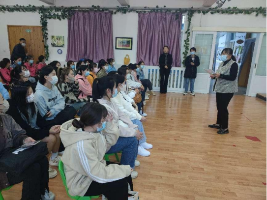 张静园长向员工们介绍了幼儿园的基本情况,以及本学期的实习安排,强调了幼儿园的基本规章制度与防疫防控的注意事项。并组织员工与带班教师进行了简单的见面,将员工进行了分班安排。