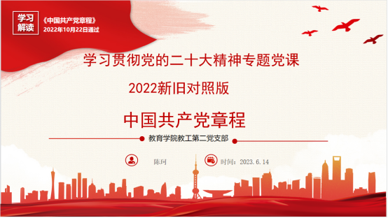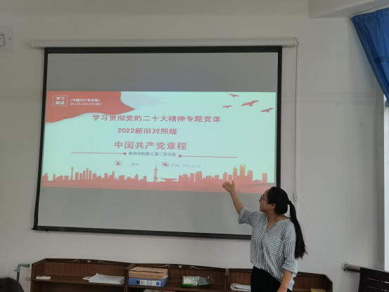 为落实党政办发〔2023〕8 号《关于进一步推进基层党支部深入开展主题教育有关工作的通知》文件要求,6月14日下午,太阳集团tyc33455cc第二党支部在1号教学楼1407室召开会议,支部书记陈珂以“2022新旧对照版—中国共产党章程”为题,为全体党员讲了党课。