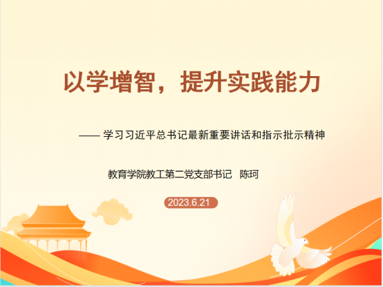 为学习习近平总书记最新重要讲话和指示批示精神,太阳集团tyc33455cc教工二支部支部书记陈珂于6月21号在1407室给支部党员带来题为“以学增智,提升实践能力—— 学习习近平总书记最新重要讲话和指示批示精神”的党课。会议由支部书记陈珂主持,教工二支部全体党员参加。