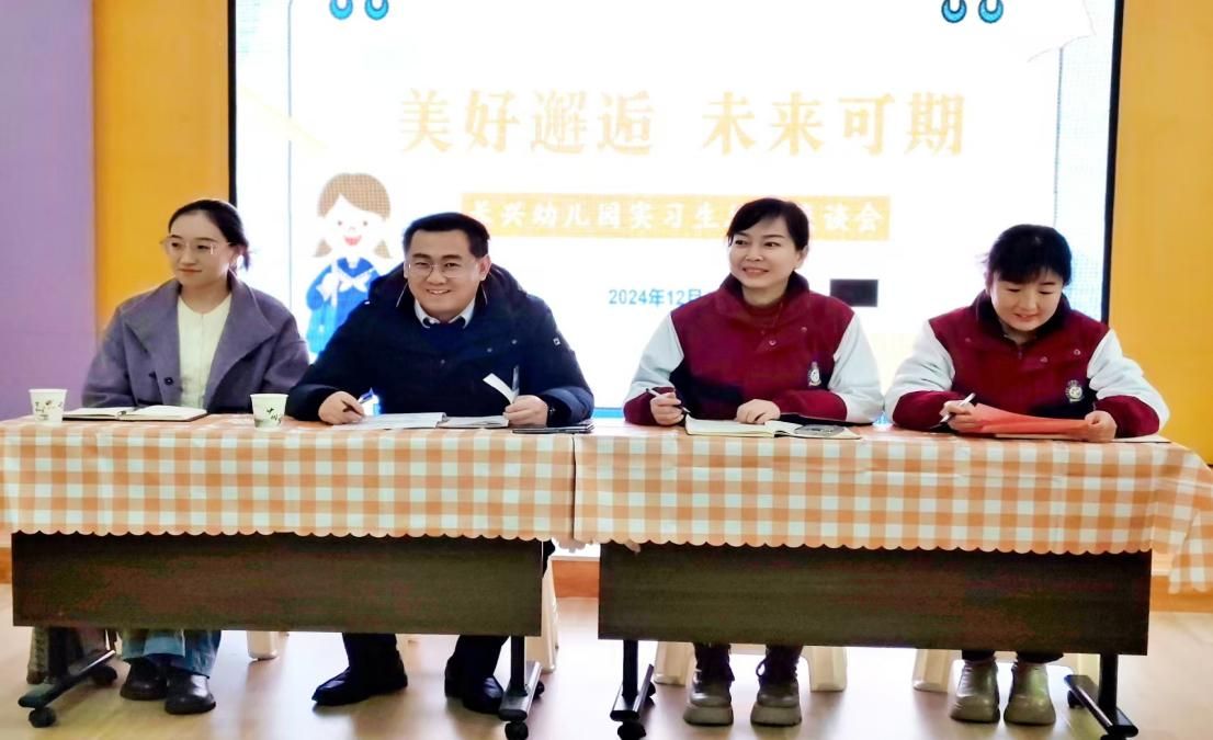 2024年12月19日下午,教育公司党政办主任屈玉渊和实习带队教师田露赴长兴幼儿园开展实习生座谈会,园长刘亚娟,各班主任及16名实习生参加会议,长兴幼儿园办公室主任哈莎莎主持座谈会。