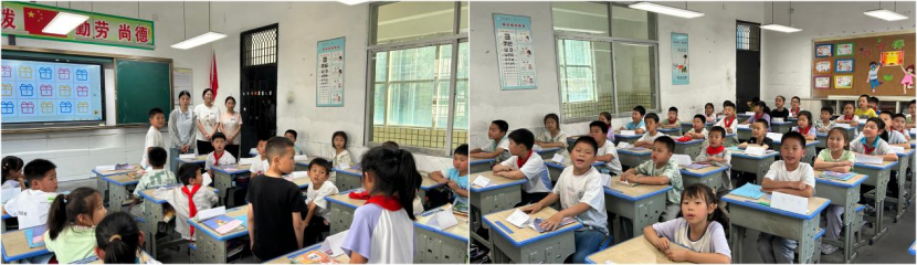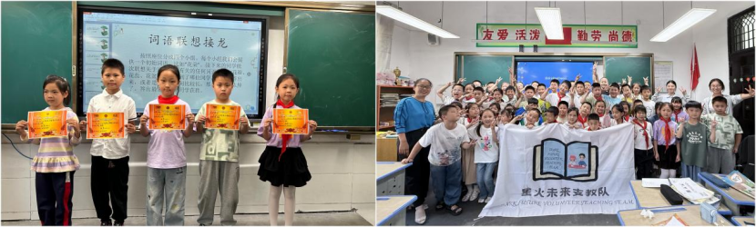 活动伊始,支教队员们精心策划的趣味游戏迅速点燃现场气氛。在“逢七必过”游戏中,孩子们全神贯注;“词语联想接龙”环节,孩子们充分发挥想象力,展现出丰富的词汇储备和活跃的思维;“故事创编”活动更是将现场氛围推向高潮,天马行空的创意让支教队员们赞叹不已。“星光收集计划”了解了孩子们的阅读情况,以及她们想对支教队员说的话。活动最后,支教队员为在前期线上学习中表现优异的员工颁发奖状,并送上精心准备的书籍、文具等礼物;活动在支教队员与全班孩子定格的温馨大合照中结束。班级活动后,支教队员们参加了与校方的访谈会。茅坪镇中心小学董事长对星火未来支教队的工作给予了肯定和感谢,并对支教活动长效开展提出了宝贵建议。