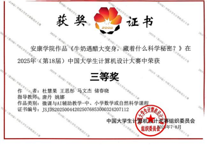 本次获奖作品《牛奶遇醋大变身,藏着什么科学秘密?》由杜慧果、王思彤、马文杰、储春晓四位同学共同创作完成,唐丹、姚娜两位老师全程指导。该作品巧妙融合科学探究与信息技术,设计新颖,体现了较高的教学应用价值。