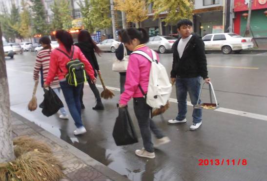 2013年11月8日早上七点,在教育科学系员工党支部书记赵斌老师的带领下,第三十六期全体入党积极分子在图书馆前集合。首先由赵老师为大家简单介绍此次活动以及指定了劳动区域,接下来由教育科学系员工党员李海艳为各班划分劳动区域。安排完之后,入党积极分子们就开始打扫各自的区域卫生了。早上虽然天公不作美,但是丝毫没有影响到同学们的干劲,你来扫我来装,同学们干的如火如荼!早上八点,打扫完区域卫生,我们结束了此次愉快的双创志愿社会实践活动。