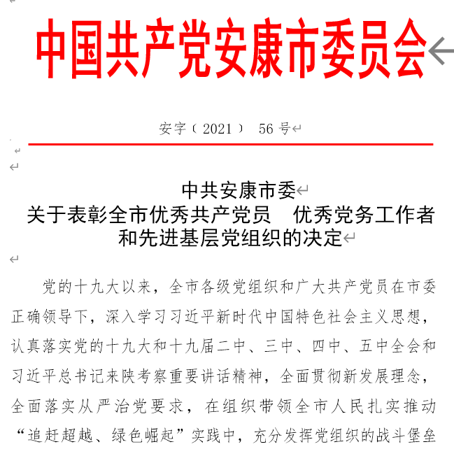 根据《中共安康市委关于表彰全市优秀共产党员 优秀党务工作者和先进基层党组织的决定》安字【2021】56号文件,tyc33455cc教育公司党总支被中共安康市委员会授予“安康市先进基层党组织”称号。