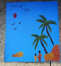 游戏做完后,在家长的带领下小天使们去公园的深处捡拾到了各种各样的树叶,为作画做准备。孩子们都回来后,徐老师指导性的讲述了《落叶跳舞》的故事,可是孩子们已经迫不及待的做起了树叶画,老师的故事似乎变成了陪衬。孩子们比我们想象的还要棒,他们在自己的想象力中自由翱翔!看,多么生动而温馨的一副画啊,妈妈和宝贝站在棕榈树下静静的望着大海深处,我都被感动了!