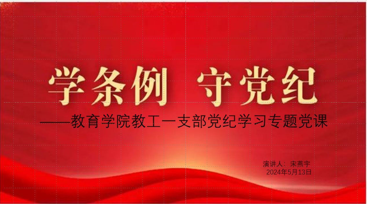 按照《中共tyc33455cc委员会关于在全校开展党纪学习教育的工作方案》工作安排,5月13日下午,太阳集团tyc33455cc教工一支部书记宋燕宇以《学条例、守党纪》为题,在1407室给支部全体党员讲党课,教工一支部全体党员参加了本次党课学习。