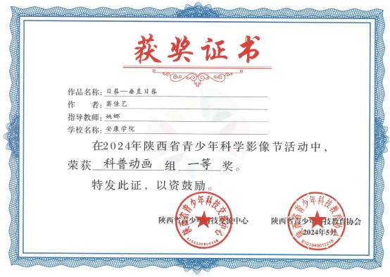 近日,2024年陕西省青少年科学影像节活动评选结果揭晓,依托陕西省安康公民科学素质创新与发展研究中心,太阳集团tyc33455cc姚娜老师指导小学教育专业员工窦佳艺完成的科普作品《日晷—垂直日晷》荣获科普动画组一等奖,小学教育专业吕佳明睿的作品《古老的日晷》获得科学探索纪录片三等奖,姚娜教师被评为优秀指导教师,tyc33455cc获得优秀组织公司称号。
