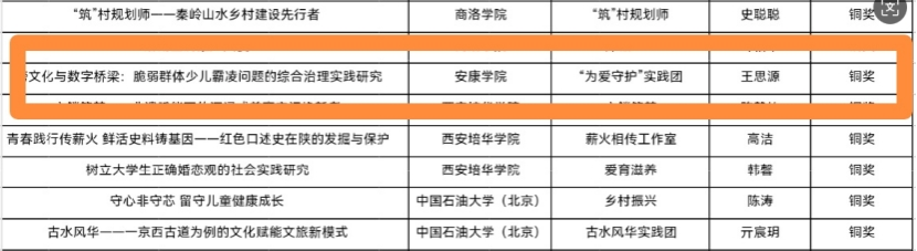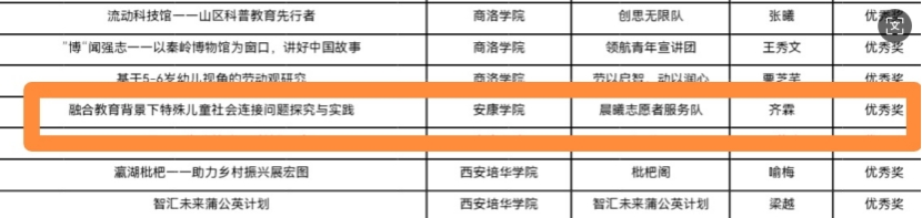 由李支其副经理悉心指导,王思源等同学积极申报的项目《跨文化与数字桥梁:脆弱群体少儿霸凌问题的综合治理实践研究》,凭借其对少儿霸凌这一社会热点问题深入且创新的研究视角,以及切实可行的综合治理方案,在大赛中脱颖而出,荣获铜奖。李静老师指导齐霖等同学申报的项目《融合教育背景下特殊儿童社会连接问题探究与实践》也备受关注。该项目聚焦融合教育背景下特殊儿童社会连接的关键问题,通过深入探究与实践,展现出了独特的价值,最终荣获优秀奖。