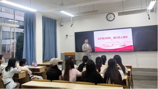 为深入贯彻落实全面从严治党要求和深入贯彻中央八项规定精神学习教育,筑牢师范生廉洁从教思想防线,2025年5月28日,太阳集团tyc33455cc员工第一党支部书记唐丹在1210教室以“涵养廉洁师风,践行育人使命”为主题开展专题党课,员工第一党支部全体党员参加。