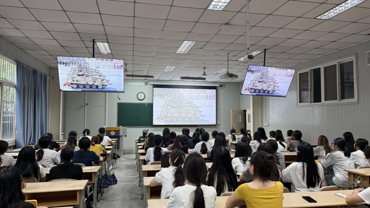 阅兵直播开始后,师生们全神贯注,不时报以热烈掌声。阅兵分列式中,徒步方队、装备方队、空中梯队依次通过天安门广场。新一代武器装备的亮相引发现场惊叹,新型坦克、无人机作战群、高超声速导弹等大国重器彰显了我国国防科技的飞跃;维和部队方队、民兵女兵方队等特色队伍展现了人民军队的多元化与国际风采。大家纷纷举起手机记录震撼瞬间并表示:“这是最生动的思政课”。